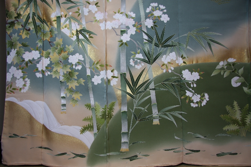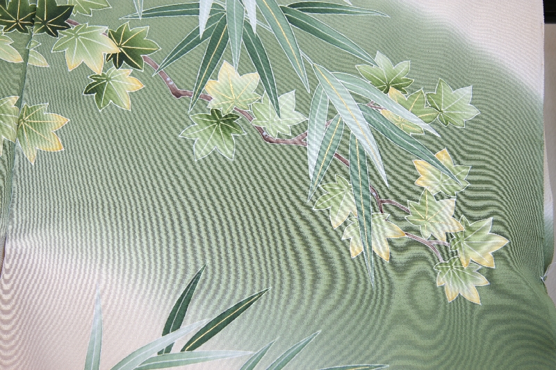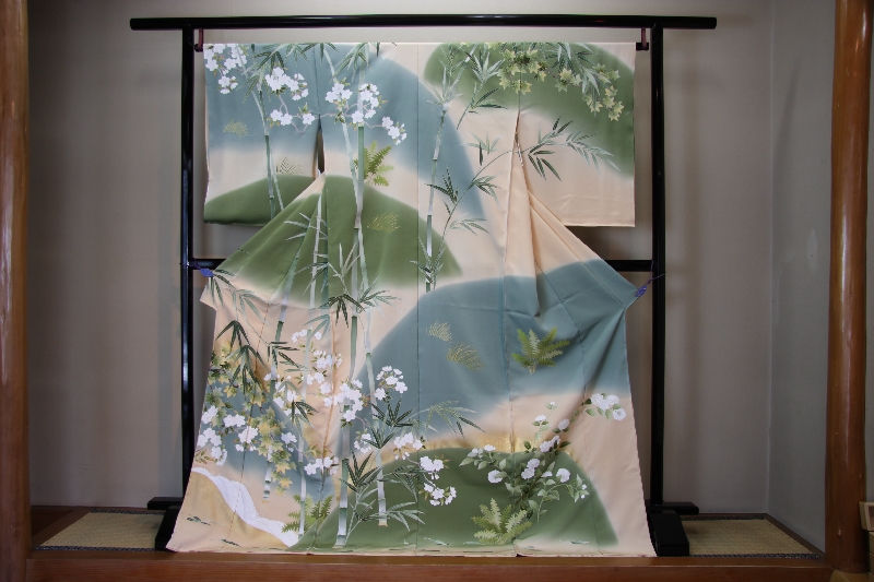 大胆な柄取りの訪問着です。ベージュ地に抹茶と浅葱色のボカシを大胆に配し、若竹と草花の模様を重ねています。
