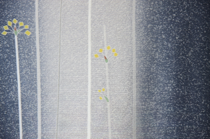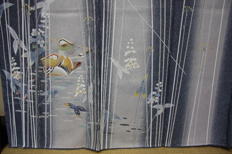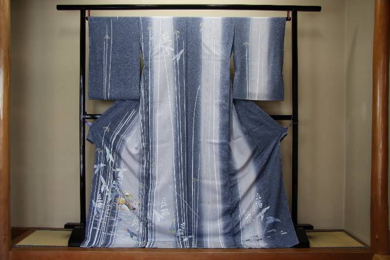 訪問着 藍鼠とグレーの縦ボカシ 水草にオシドリ柄