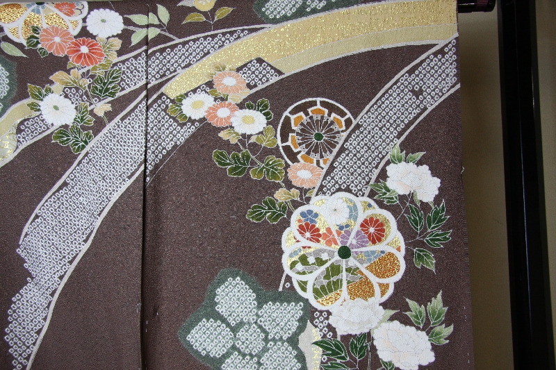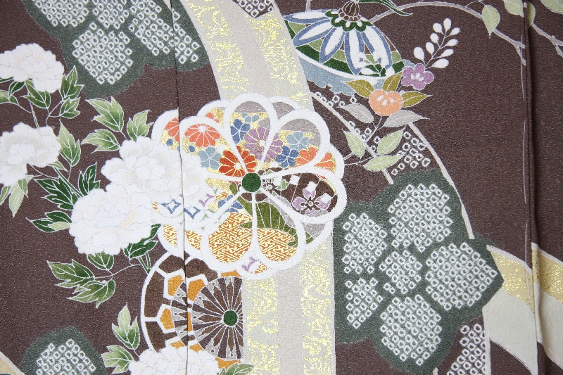 訪問着 コーヒーブラウン地 絞り入り熨斗に花模様