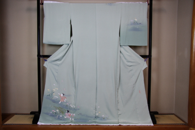 訪問着 若草地裾グリーンボカシ 野に遊ぶ童柄