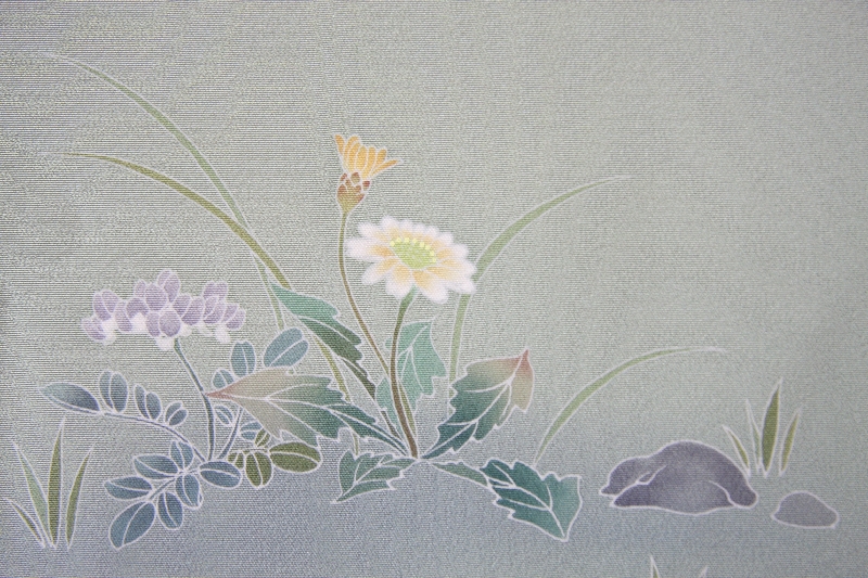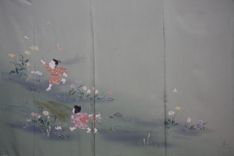 童が野原で遊ぶ姿が描かれています。若草地が柔らかな温かみを醸し出しています。春先から初夏向けてお勧めの訪問着です。