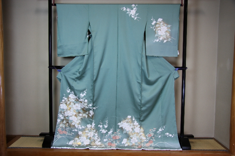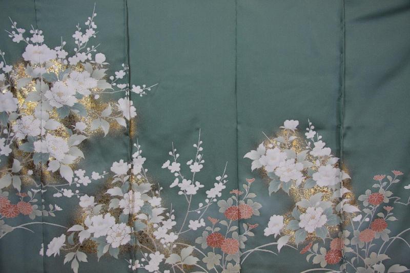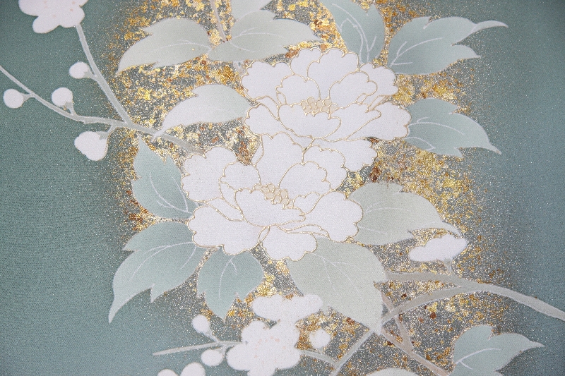 鮮やかなグリーン地に、真白の牡丹が金彩によって引き立てられています。朱系の菊もバランス良く配され、季節を問わずお召しになれる訪問着です。