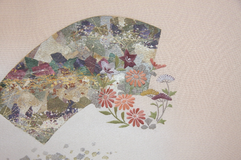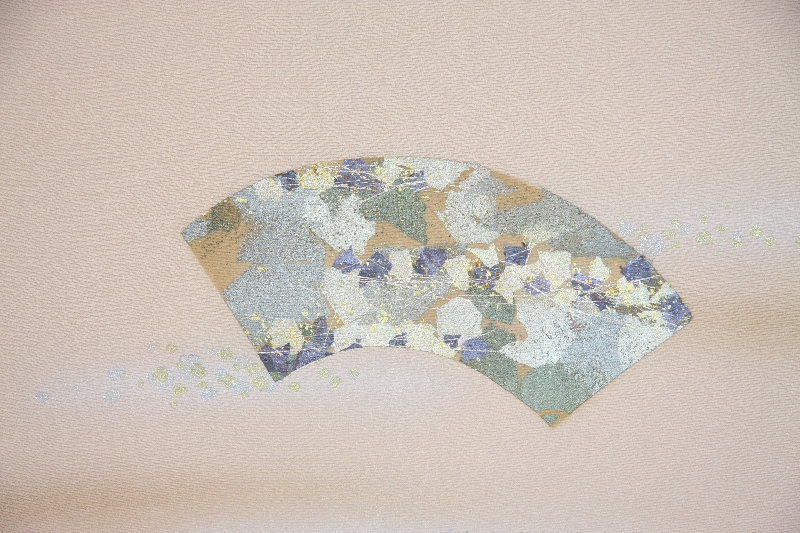 ベージュ地に、箔の地紙(扇の骨を付けていない状態)に縫いの花丸が配されています。大変上品な柄です。