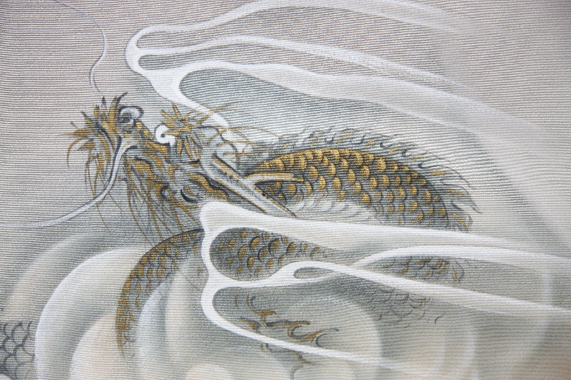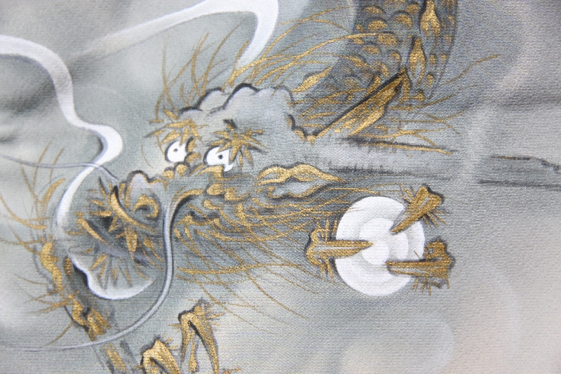 鳩羽鼠にボカシをあしらった地色に、滝の中に踊る龍が描かれています。大変大胆な柄です。