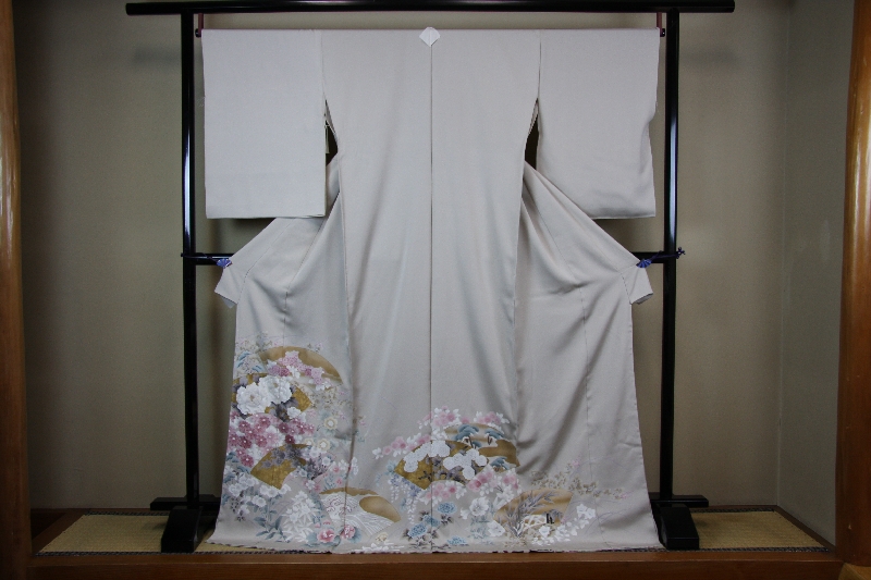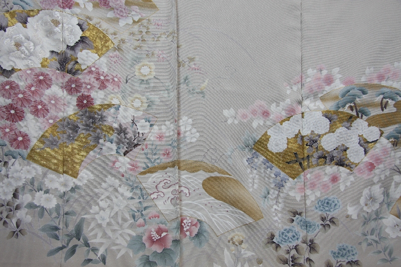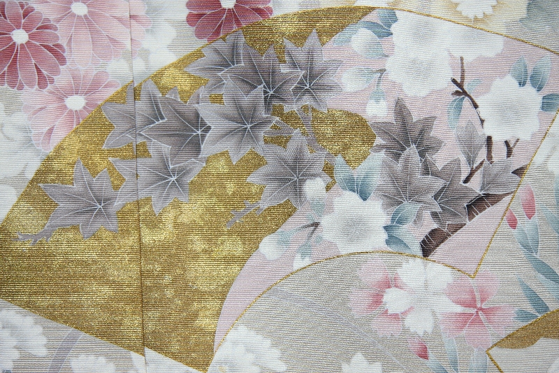 白茶地に、地紙(扇に骨を付ける前)四季の花々が描かれています。上品でありながら大胆な柄です。