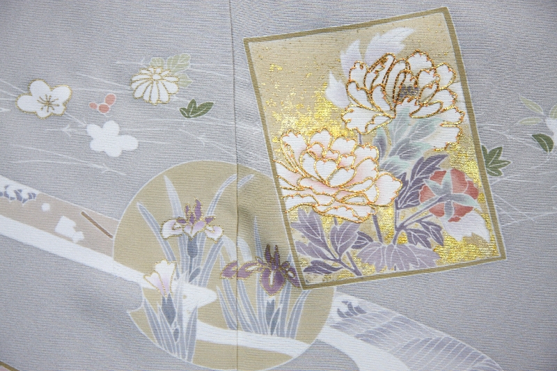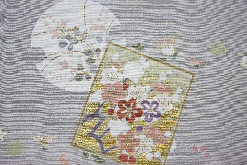 銀鼠地に、流水と花の色紙が描かれています。上品な柄の一品です。