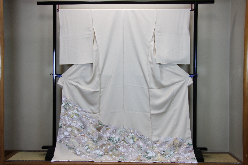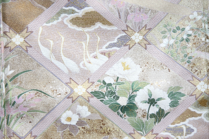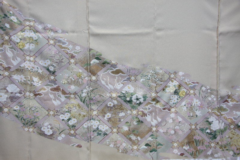 ベージュ地に、格天井に花鳥文様が描かれています。上品な柄の一品です。