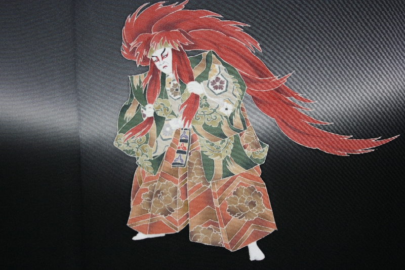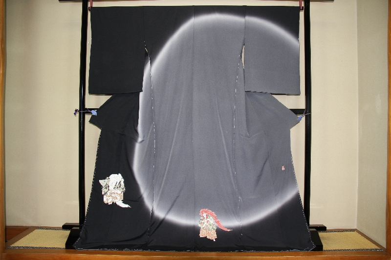 黒と鼠色ボカシの染分けに連獅子を見事に染上げた訪問着。