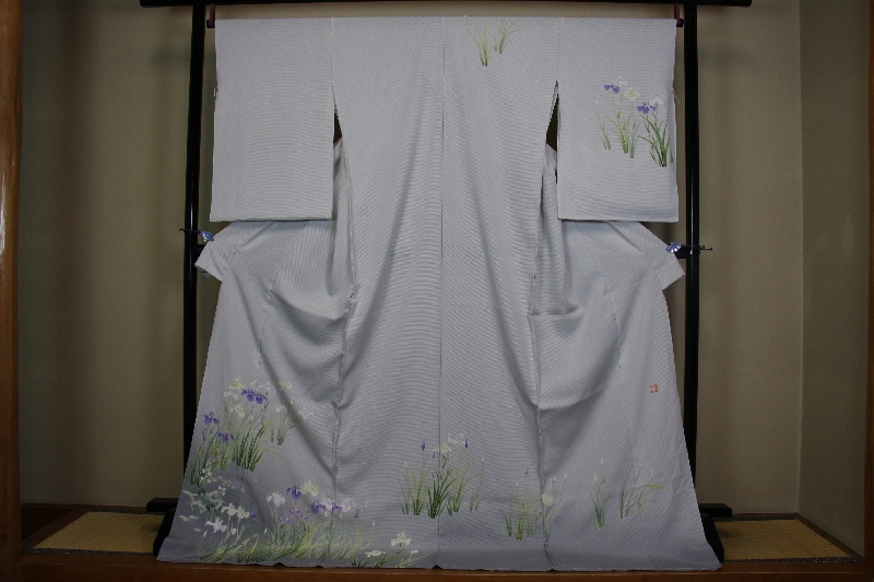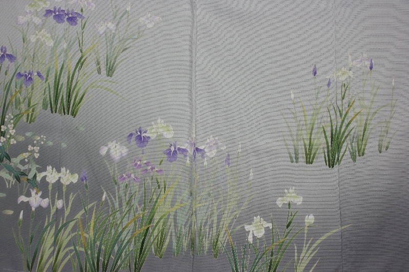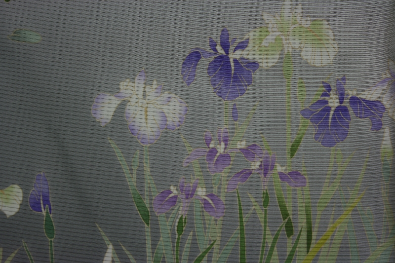 銀鼠地に裾濃いボカシに菖蒲柄の涼しげな絽の訪問着。